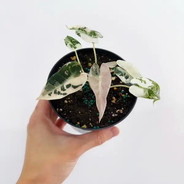 Watering is the trickiest part of Alocasia care. The Bambino Variegated needs consistently moist soil but is extremely sensitive to overwatering.