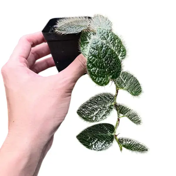 Ficus villosa, commonly known as the shaggy-leaf fig or villous fig, is a captivating and unique climbing plant native to Southeast Asia. It’s highly sought after for its distinctive, velvety leaves that emerge with a reddish-bronze hue and mature to a deep green. The name “villosa” refers to the soft, fine hairs that cover its leaves and stems, giving it a shaggy appearance. It is an excellent choice for terrariums and vivariums due to its love for high humidity and its climbing habit.
