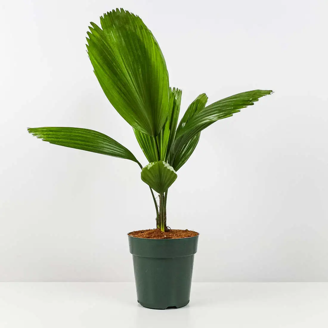 Licuala Grandis Palm, scientific name Licuala grandis, is an exotic fan palm that is well-known for its stunning green ruffled leaves. This Palm is a striking houseplant that will become a statement in any space. Licuala Grandis are Loved by many for its tropical feel and beauty, it offers air cleaning properties, this slow growing easy care palm enjoys bright spaces and moderate watering to maintain soil moist.
