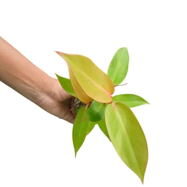 The Philodendron ‘Prince of Orange’ is a stunning and popular hybrid known for its vibrant, ever-changing leaf colors. New leaves emerge as a brilliant orange or coppery color, and as they mature, they transition to a lime green, then a deep, glossy green. It is a “self-heading” variety, meaning it has a compact, bushy growth habit and does not vine or require a climbing pole.