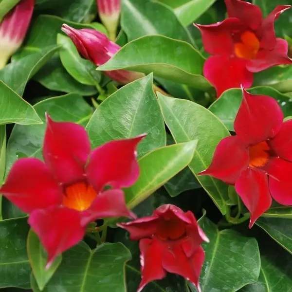 The Red Mandevilla grows well in hot climates and is known well for its vining abilities. Many people adorn their telephone poles and mailboxes with the showy trumpet-shaped flowers.