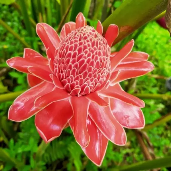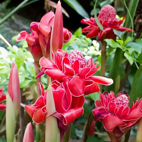 A giant loose in the garden! Etlingera stems can grow to heights of 18 to 20 feet and sport 3 foot long leathery leaves that are dark green. In late summer/fall flower stems grow to 3 to 6 feet in height. Atop the lofty stem is a red waxy flower cluster which reminds one of a lit torch. This is among the worlds most tropical looking exotics.